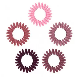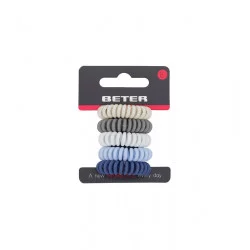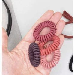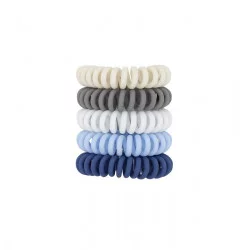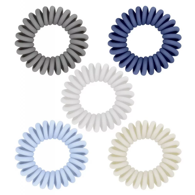 Cinco coleteros  en espiral  en tonos tierra o azules y acabado mate. Gracias a su forma no dejan marcas ni se enredan en el cabello, además pueden ser unas pulseras superbonitas.