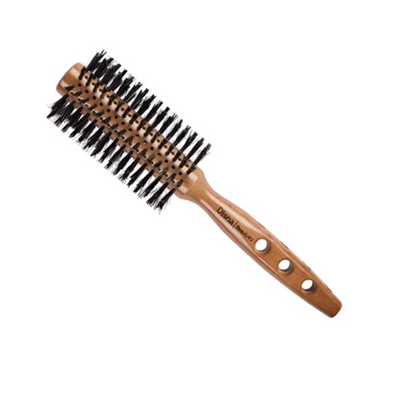 Cepillo redondo con cuerpo de madera y cerdas de jabalí que no dañan el cabello y le aportan brillo.