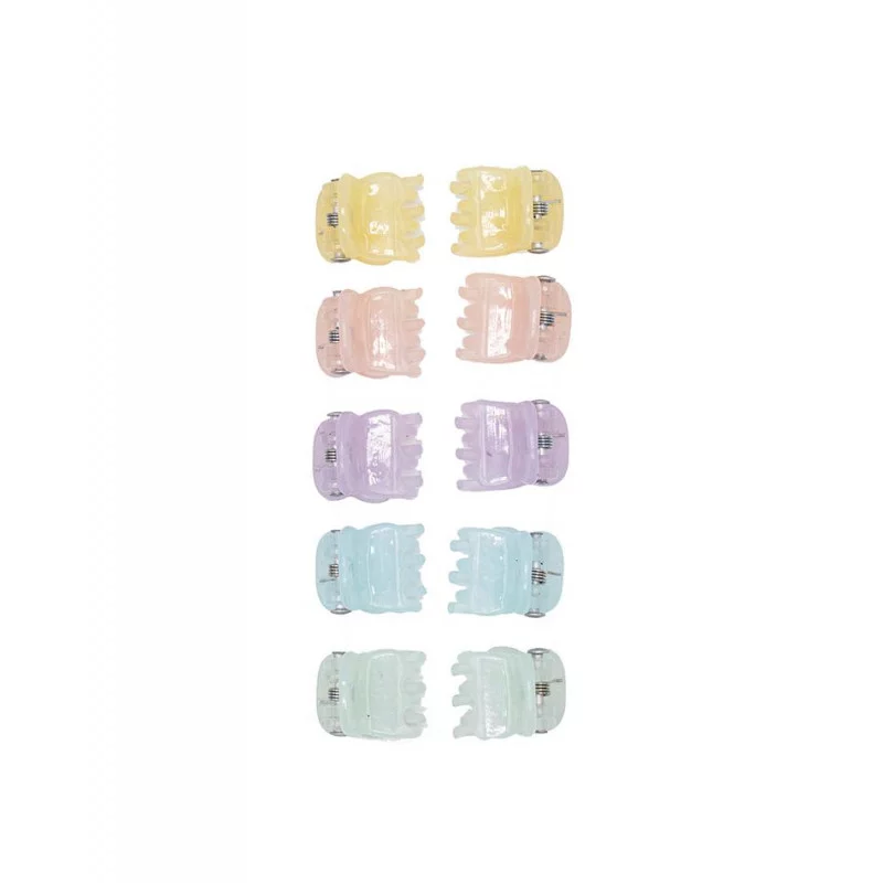 Set de diez mini grapas en los distintos tonos de la colección. El acabado semitransparente  efecto “jelly” va a encantar a pequeñ@s y no tan pequeñ@s. Para recogidos con mucho estilo y color.