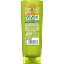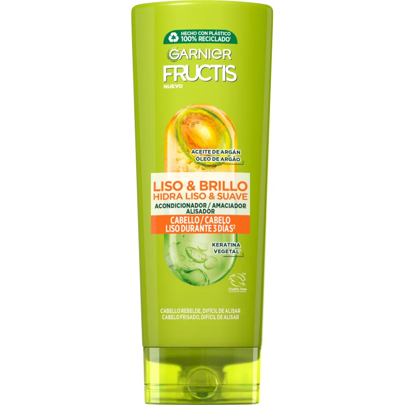 El acondicionador Fructis Liso & Brillo es un acondicionador fortificante enriquecido con aceite de argán natural y keratina vegetal líquida, ingrediente con propiedades reconstituyentes, que desenreda, disciplina, protege la fibra capilar del encrespamiento y mantiene el liso por más tiempo sin apelmazar.