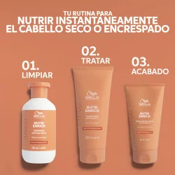 Aplicar en el cabello húmedo y limpio después del champú. Dejar actuar 5 minutos y enjuagar. Usar con champú y mascarilla Nutri Enrich una vez a la semana.
