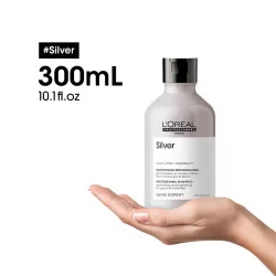 Muestra tu pelo blanco. El cabello blanco o gris se limpia e ilumina a fondo con el champú Silver de L'Oréal Professionnel. elimina la posibilidad de que este tipo de cabello desarrolle una tendencia amarillenta al neutralizar los tonos indeseables. Tendrás un cabello más blanco y brillante porque este champú contiene pigmentos violetas.