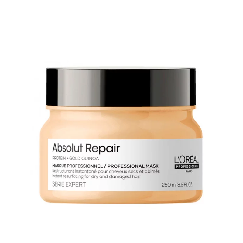 Absolut Repair Gold Quinoa Mask de L'oreal Paris Professional es adecuada para todo tipo de cabello. Tiene una textura de piel cremosa y cabello claro. Aplicar sobre el cabello seco, dejar actuar de 3 a 5 minutos y luego enjuagar.