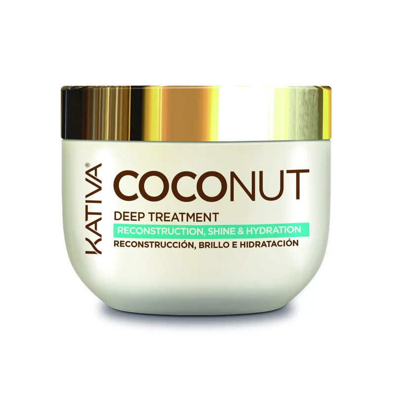 Kativa Coconut Deep Treatment, tratamiento intensivo con aceite de Coco orgánico que reconstruye e hidrata profundamente la fibra capilar, dejando el cabello visiblemente sano, brillante y suave.
