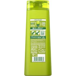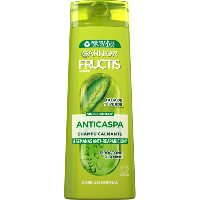El champú Fructis Anticaspas un champú fortificante enriquecido con esencia de limón, extracto de té verde y zinc pyrithione anti-bacteriano para limpiar, equilibrar el cuero cabelludo y eliminar la caspa.