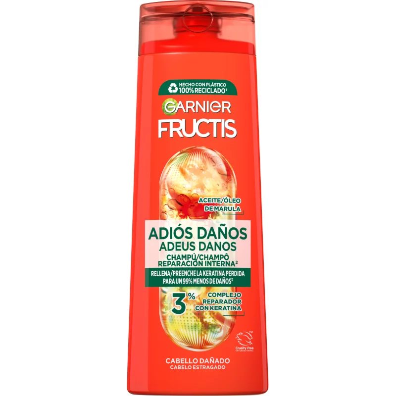 El champú Fructis Adiós Daños es un champú fortificante enriquecido con extracto de amla y keraphyll para nutrir, reparar en profundidad y renovar el pelo hasta las puntas. Repara la superficie de la fibra y rellena las grietas causadas por las agresiones externas.