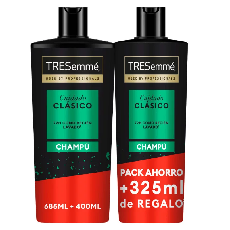 "El champú TRESemmé Cuidado CLÁSICO, revitaliza tu cabello con la ayuda de nuestro sistema de Cuidado Clásico, formulado con las Vitaminas B3, B5, B7, C, E, y diseñado para purificar y limpiar suavemente tu cuero cabelludo con cada lavado. 72 horas como recién lavado*.