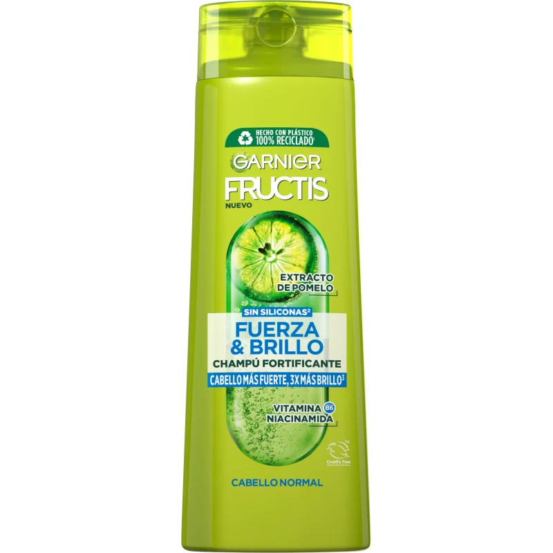 El champú Fructis Fuerza y Brillo 2 en 1 es un champú fortificante enriquecido con esencia de pomelo y vitaminas B3 y B6 para limpiar, fortificar y tonificar la fibra del cabello desde la raíz.