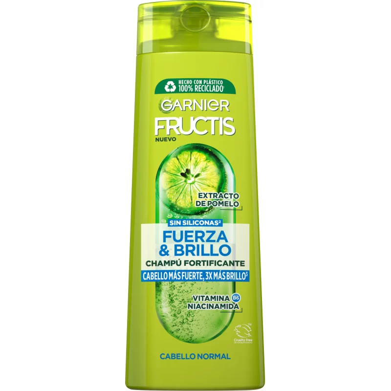 El champú Fructis Fuerza y Brillo es un champú fortificante enriquecido con esencia de pomelo y vitaminas B3 y B6 para limpiar, fortificar y tonificar la fibra del cabello desde la raíz.