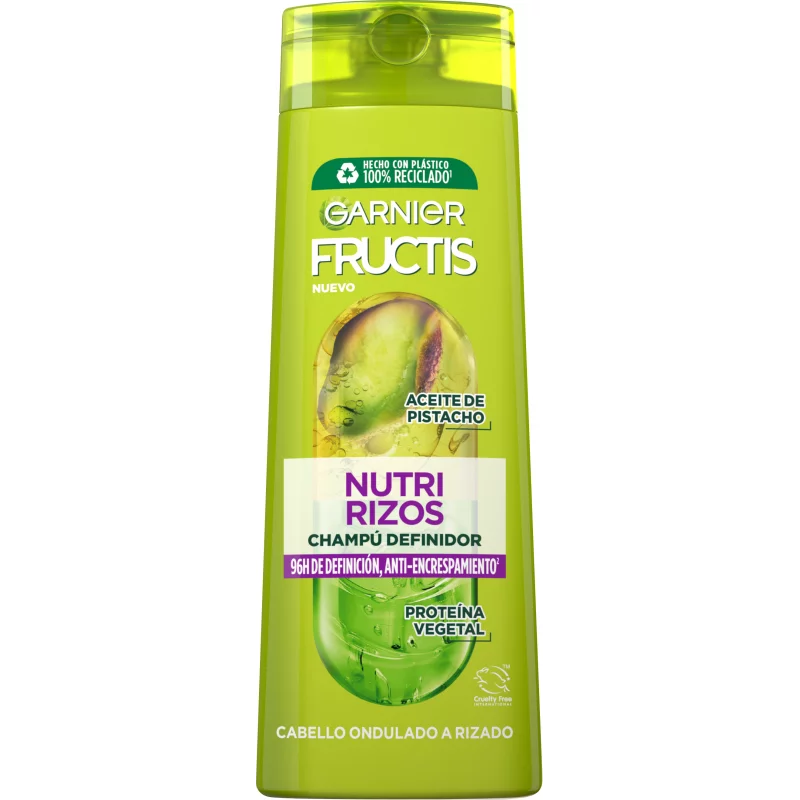 El champú Fructis Nutri Rizos es un champú fortificante enriquecido con extracto de bambú natural y filoxane para limpiar, nutrir, controlar el encrespamiento y definir los rizos para mantenerlos elásticos y con movimiento.