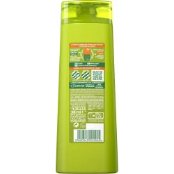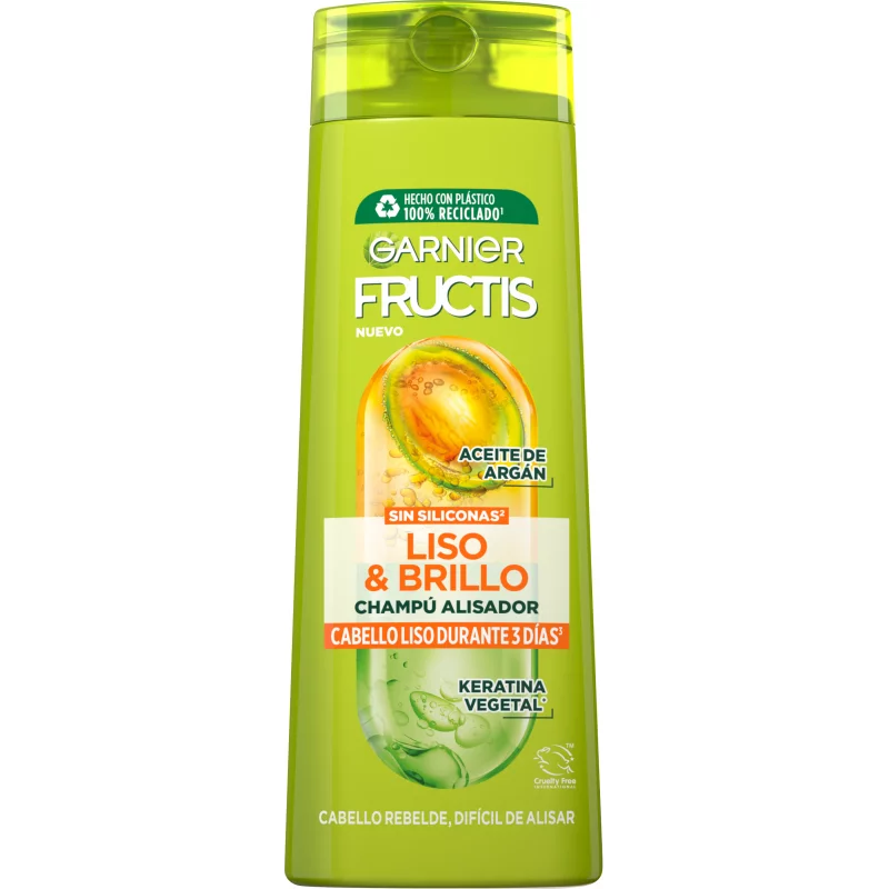 El champú Fructis Liso & Brillo es un champú fortificante enriquecido con aceite de argán natural y keratina vegetal líquida, ingrediente con propiedades reconstituyentes para limpiar, disciplinar, proteger la fibra capilar del encrespamiento y mantener el liso sin apelmazar.