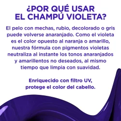 Champú Matizador anti-efecto anaranjado. Indicado para pelo con mechas, rubio, decolorado o gris. Matiza los tonos anaranjados/amarillentos no deseados gracias a su fórmula con pigmentos violetas, al mismo tiempo que limpia con suavidad.