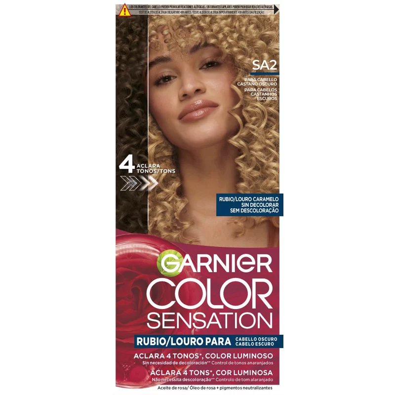 Descubre el tinte Color Sensation Rubio Caramelo de Garnier diseñado específicamente para cabellos oscuros. Este innovador producto aclara hasta 4 tonos sin necesidad de realizar una decoloración previa.