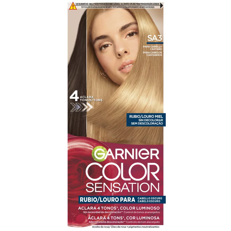 Descubre el tinte Color Sensation Rubio Miel de Garnier diseñado específicamente para cabellos oscuros. Este innovador producto aclara hasta 4 tonos sin necesidad de realizar una decoloración previa.