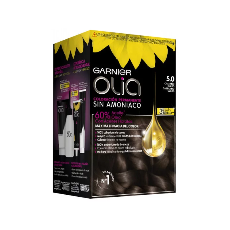 Garnier Olia es una coloración permanente con aceites florales de origen natural, sin amoniaco para un olor agradable y respeto del cuero cabelludo. Coloración tras coloración, mejora visiblemente la calidad de tu pelo para un color intenso más brillante y más bonito, y un pelo sedoso y cuidado. 100% cobertura de canas.