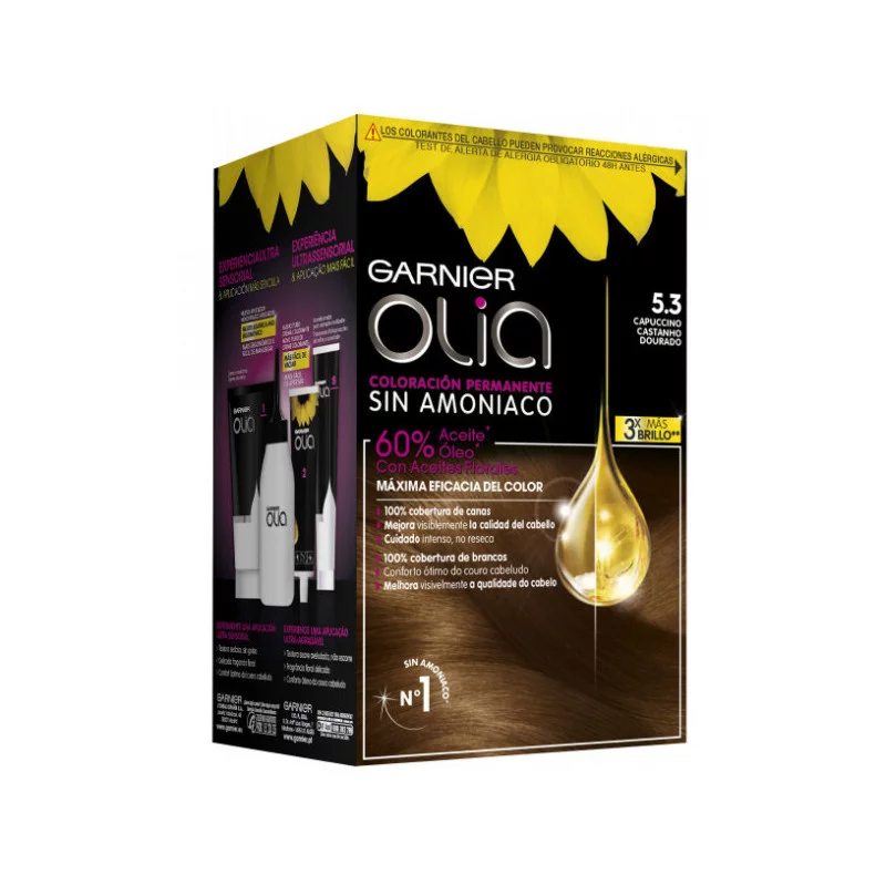 Garnier Olia es una coloración permanente con aceites florales de origen natural, sin amoniaco para un olor agradable y respeto del cuero cabelludo. Coloración tras coloración, mejora visiblemente la calidad de tu pelo para un color intenso más brillante y más bonito, y un pelo sedoso y cuidado. 100% cobertura de canas.