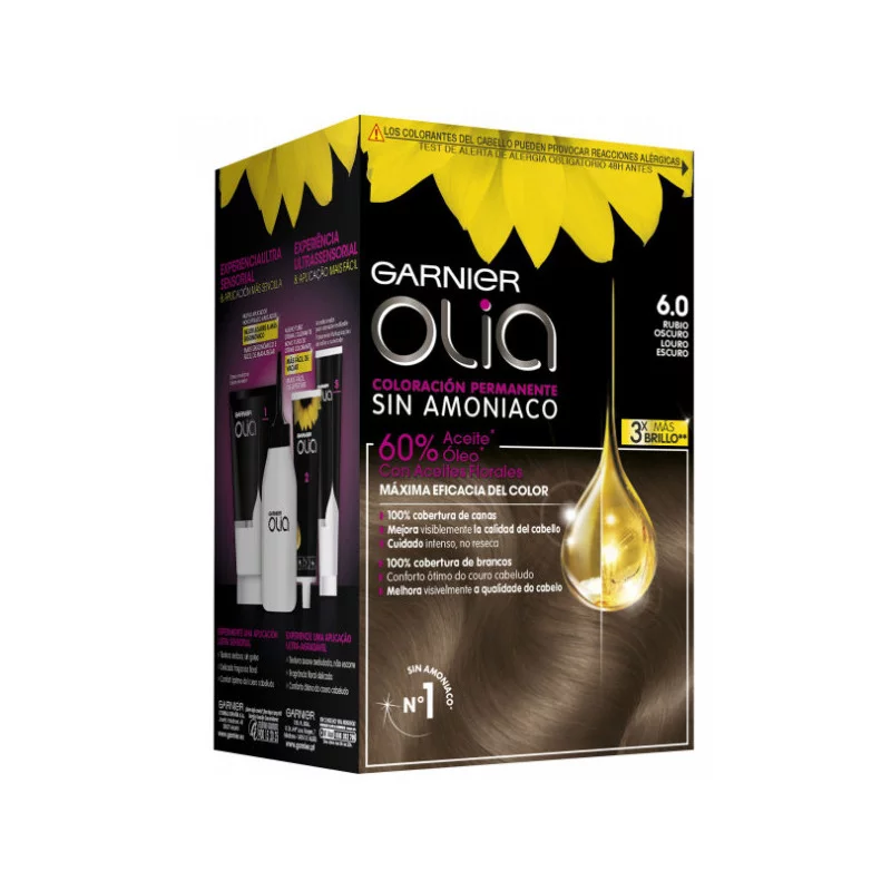 Garnier Olia es una coloración permanente con aceites florales de origen natural, sin amoniaco para un olor agradable y respeto del cuero cabelludo. Coloración tras coloración, mejora visiblemente la calidad de tu pelo para un color intenso más brillante y más bonito, y un pelo sedoso y cuidado. 100% cobertura de canas.