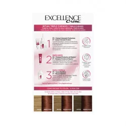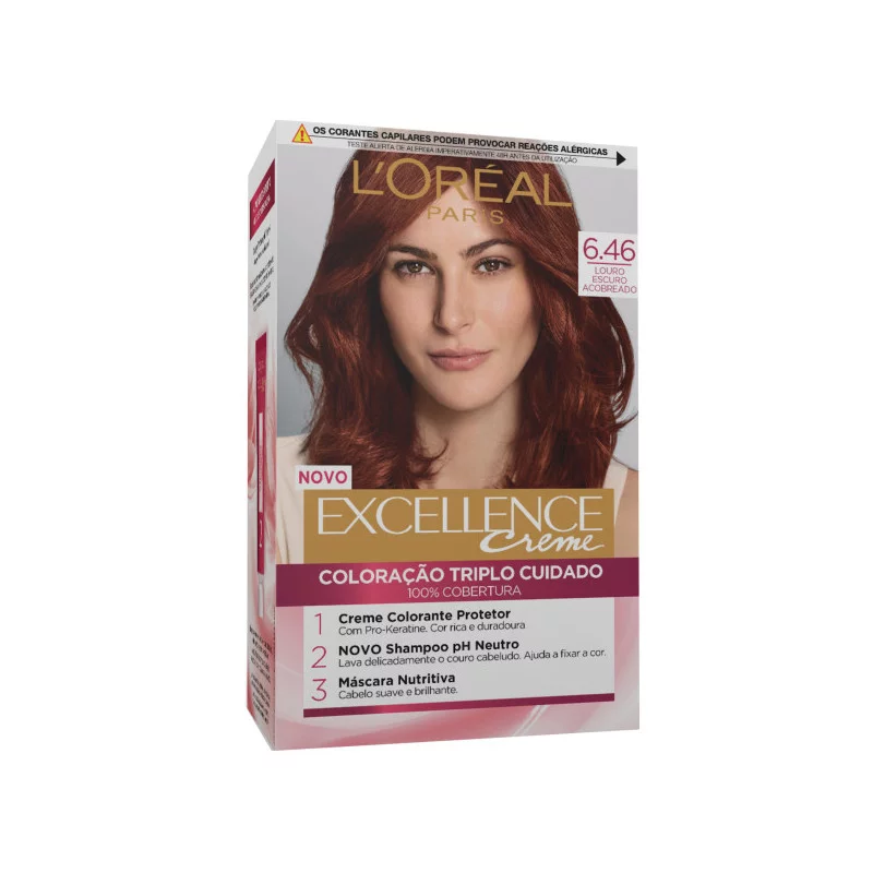 La Crema Color Triple Cuidado Avanzado Excellence, con Pro-Keratina Tono 6.46 Cobrizo Caoba , protege el cabello antes, durante y después de la coloración con un 100% de cobertura de canas.