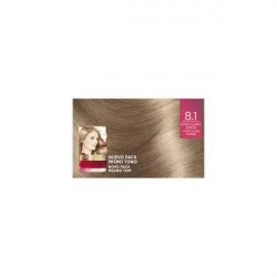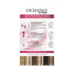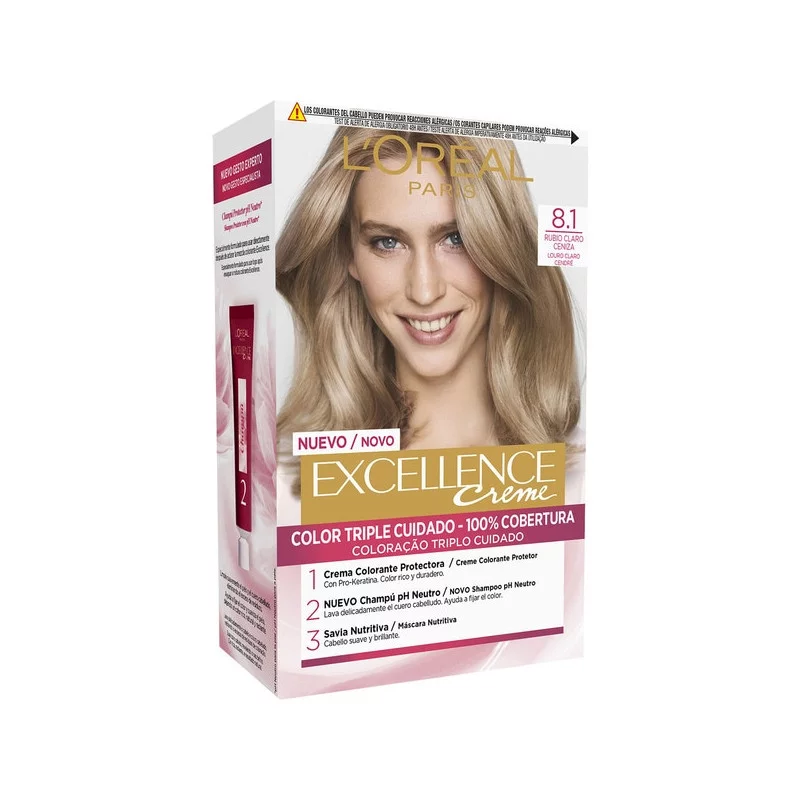 La Crema Color Triple Cuidado Avanzado Excellence, con Pro-Keratina Tono 8.1 Rubio Claro Ceniza, protege el cabello antes, durante y después de la coloración con un 100% de cobertura de canas.