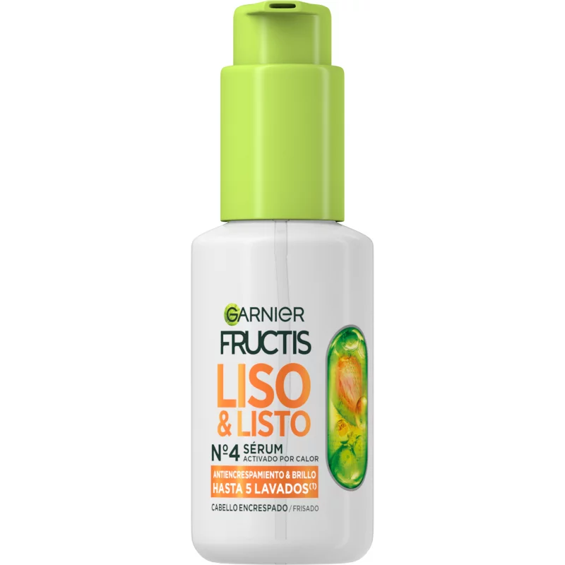 Garnier Fructis Nº4 Sérum Activado por calor Liso & Listo para cabello encrespado, proporciona hasta 10 días de liso & brillo(1). Cubre el cabello con una capa protectora de calor y waterproof, para un liso duradero, sin encrespamiento y lleno de brillo. 1.Test instrumental después de la aplicación del sérum.