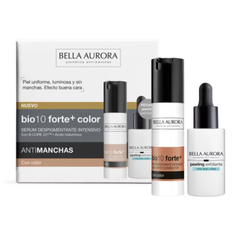 bio10 forte+ color es un sérum despigmentante intensivo formulado para eliminar eficazmente las manchas oscuras. Incorpora la exclusiva tecnología B-CORE 221™ que actúa de forma integral en las fases del proceso de formación de las manchas, para una acción despigmentante profunda y duradera. Incorpora pigmentos de color encapsulados que se adaptan al tono de la piel, unifican y aportan un efecto buena cara inmediato, con acabado natural. Además, contiene Ácido Hialurónico que hidrata intensamente y extracto de Camu Camu, de alto poder antioxidante y revitalizante.
