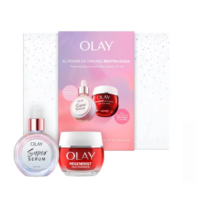 Descubre el poder de una piel revitalizada con el pack de OLAY que incluye dos de sus tratamientos más potentes para lograr una piel más suave, firme y rejuvenecida. Este set de cuidado facial combina el OLAY Super Sérum 5 Beneficios en 1 y la OLAY Regenerist Niacinamida Crema Facial de Día con SPF30, para ofrecerte un cuidado integral y completo para tu piel.