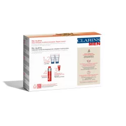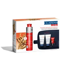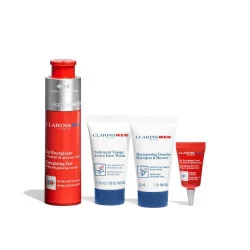 Los cuatro tratamientos esenciales faciales para una piel en plena forma a pesar de un estilo de vida intenso. Un gel hidratante y fortalecedor con extracto de ginseng rojo que revitaliza todas las pieles, un gel superfresco y revitalizante formulado especialmente para la piel frágil del contorno de ojos, un gel espumoso para limpiar el rostro y purificar la piel y Double Serum Light Texure para combatir los signos de la edad. El ritual perfecto por la mañana y por la noche. Todos estos tratamientos se presentan en un bonito neceser azul ClarinsMen.