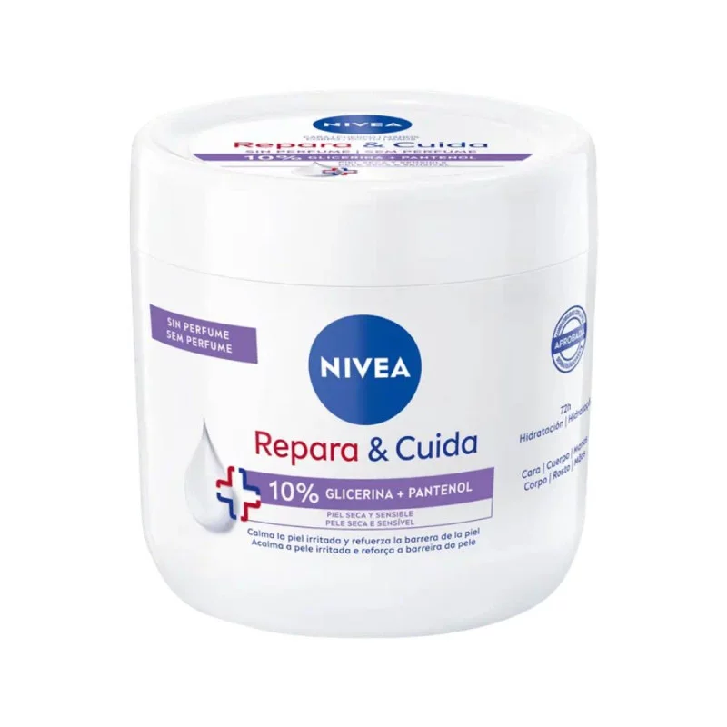 Calma la piel seca y sensible con NIVEA Repara & Cuida Crema con 10% Glicerina y Pantenol sin perfume. Su fórmula calma la piel irritada y refuerza la barrera de la piel.