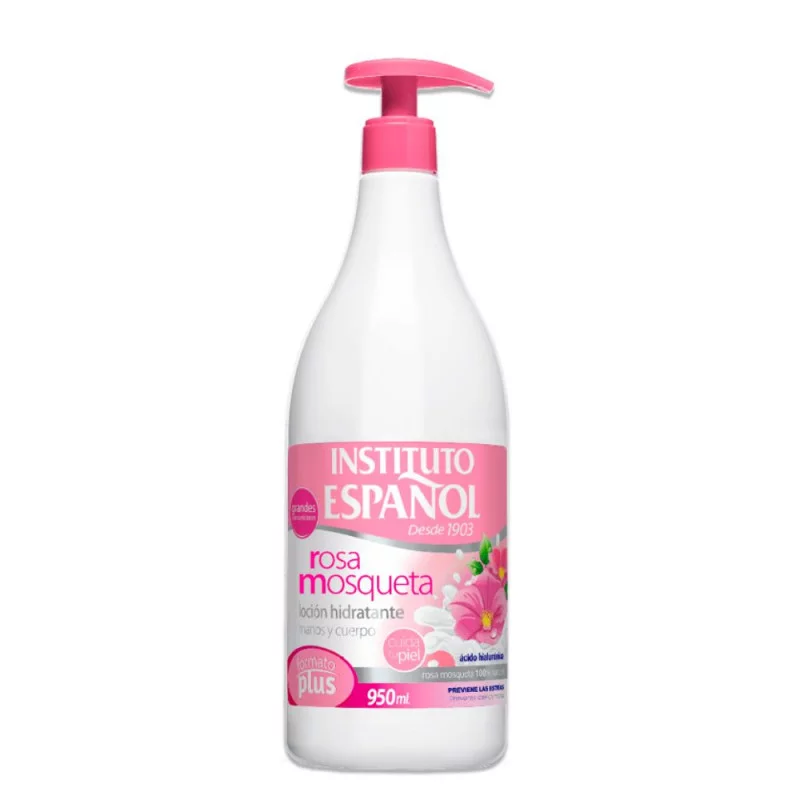 La Loción Hidratante Instituto Español está enriquecida con Rosa Mosqueta y ácido hialurónico, de manera que estimula la hidratación y la elasticidad natural de la piel y ayuda a eliminar cicatrices y estrías. La Rosa Mosqueta tiene una gran propiedad que revigoriza las células productoras de colágeno, elastina y ácido hialurónico que son responsables de la firmeza y elasticidad de la piel. El ácido hialurónico, que atrae potentemente al agua, es un hidratante de la piel. Favorece la lubricación de las fibras de colágeno, por lo que la piel es más firme. La potente combinación de Rosa Mosqueta y ácido hialurónico retrasan el envejecimiento de la piel.