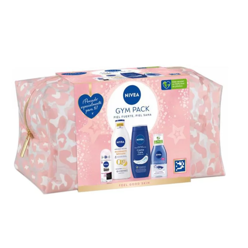 El Pack NIVEA Gym incluye una selección de productos NIVEA para una rutina de cuidado completa después del gimnasio. Limpia y cuida la piel de rostro y cuerpo con el gel de ducha NIVEA Care & Orange, el gel de limpieza facial refrescante NIVEA, la loción corporal reafirmante e hidratante NIVEA Q10 Plus Vitamin C y el desodorante en roll-on NIVEA Black & White Invisible. Incluye además un neceser en color azul para llevar donde quieras.