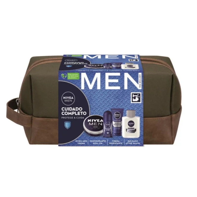 El pack de regalo NIVEA MEN Cuidado Completo contiene los productos indispensables para cualquier hombre: un bálsamo after shave NIVEA MEN Sensitive, la crema hidratante todo uso NIVEA MEN Creme para rostro, cuerpo y manos, y el desodorante en spray NIVEA MEN Black & White que protege de las manchas en la ropa y de la sudoración durante 48 horas. Incluye un práctico neceser para llevar en la maleta o la bolsa del gimnasio. Un regalo perfecto para los hombres que necesitan reponer sus productos indispensables de cuidado.