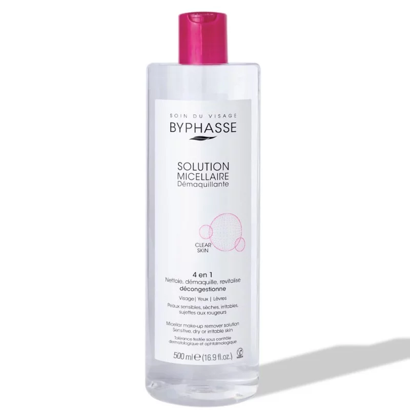 La Solución micelar desmaquillante para pieles sensibles de Byphasse limpia y desmaquilla la piel del rostro, ojos y labios de forma suave y eficaz. Su fórmula vegana, especialmente concebida para las pieles sensibles e irritables, contiene 95% de ingredientes de origen natural y respeta el equilibrio natural de la piel. Con un solo gesto, cubre 4 acciones: limpia, desmaquilla, revitaliza y descongestiona. ¡El producto vegano de última generación que tu piel necesita para una limpieza impecable!