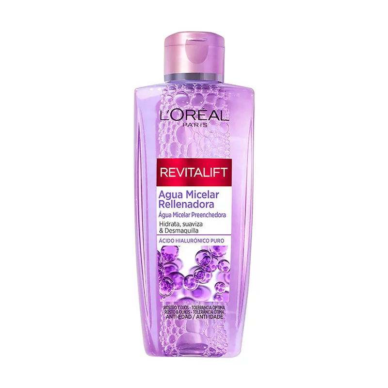 L'OREAL PARIS Revitalift Filler agua micelar de relleno con ácido hialurónico puro. Agua micelar de relleno con ácido hialurónico Revitalift Filler de Loreal Paris Elimina eficazmente el maquillaje de ojos y rostro, dejando la piel limpia y clara.