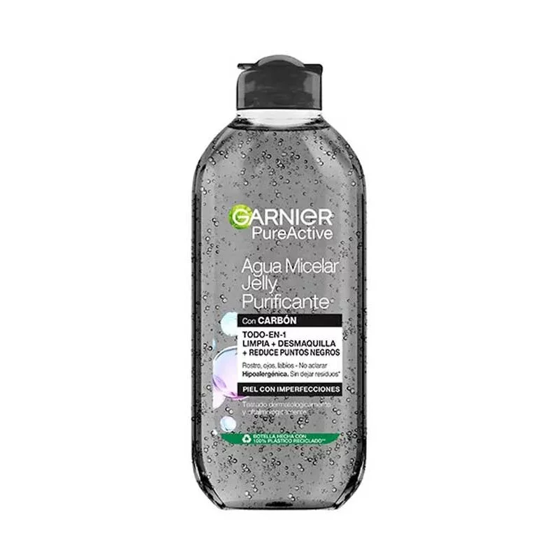 Agua micelar jelly purificante con carbón Skin Active de Garnier, que limpia, desmaquilla y purifica la piel en una pasada. Este agua micelar reduce las imperfecciones y puntos negros, purifica y matifica la piel, y además desmaquilla rostro, ojos y labios.