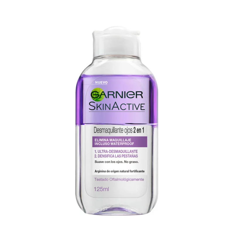 El desmaquillante de ojos 2 en 1 de Garnier elimina el maquillaje, incluido el waterproof, al mismo tiempo que fortalece las pestañas. Enriquecido con arginina de origen natural, su fórmula bifásica consigue pestañas más gruesas y densas en 4 semanas.