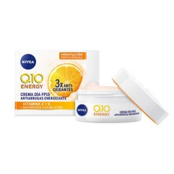 NIVEA Q10 Energy Crema de Día Antiarrugas Energizante FP 15 hidrata la piel proporcionándole un aspecto radiante durante 24 horas. Su fórmula enriquecida con 3 eficaces antioxidantes; Vitamina C, Vitamina E y Coenzima Q10 100% idéntica a la de la piel, apoya la propia capacidad de la piel para mejorar su metabolismo energético, protegiéndola de los daños que causan los radicales libres. De este modo, esta crema NIVEA con vitamina C reduce las líneas de expresión y reafirma la piel en 2 semanas, reduciendo además el aspecto apagado y los signos de fatiga del rostro. Proporciona protección UVA/UVB con FP15 para prevenir la formación de arrugas inducidas por el sol. Para una sensación de piel fresca y suave al instante. Dermatológicamente comprobado.