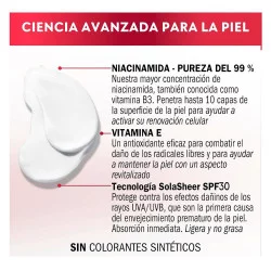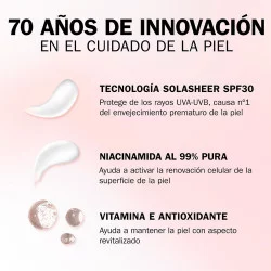La crema Niacinamida SPF30 de Olay cuenta con la inigualable tecnología SolarSheer, que ofrece una efectiva protección solar SPF30 de amplio espectro frente los rayos UVA y UVB. Ultraligera para que puedas disfrutar por fin de una crema hidratante con protección solar sin textura grasa. Su fórmula también está enriquecida con la mayor concentración de Niacinamida pura al 99% de Olay, capaz de penetrar hasta 10 capas de profundidad para ayudar a activar la renovación celular superficial. Se ha demostrado que la Vitamina E actúa como un antioxidante que ayuda a combatir los efectos perjudiciales de los radicales libres y a mantener la piel con un aspecto joven. Una combinación perfecta que garantiza la hidratación durante todo el día y unos resultados visibles: tras 1 día, la piel está más suave y revitalizada y, tras 14 días, la firmeza y la elasticidad mejoran visiblemente. Prueba el poder hidratante de la Niacinamida 24 + Vitamina E de Olay.
