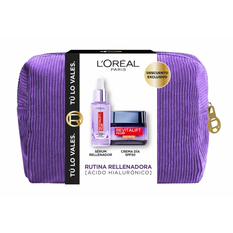 - Crema Revitalift Filler SPF50: Crema Rellenadora Intensiva SPF 50 [UVA + UVB] con Ácido Hialurónico de larga duración ME.Esta fórmula ligera ayuda a prevenir los signos del envejecimiento inducidos por los rayos UV y a proteger la elasticidad de la piel durante mucho tiempo. Apto para todos los tipos de piel. Clínicamente probado para retener el volumen. Crema Rellenadora Intensiva SPF 50 [UVA + UVB] con Ácido Hialurónico de larga duración ME.