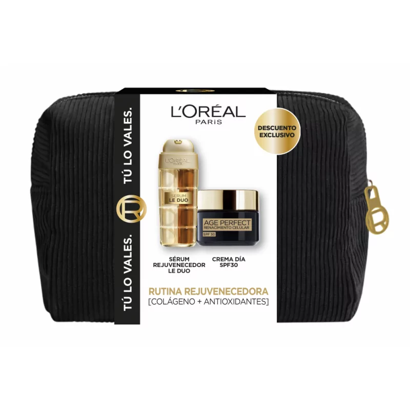 - Age Perfect Sérum Duo: L'Oréal Paris Age Perfect Sérum Rejuvenecedor Le Duo. Descubre el secreto de una piel más joven con el L'Oréal Paris Age Perfect Sérum Rejuvenecedor Le Duo, 2 sérums en 1. Este innovador sérum de uso diario combina poderosos péptidos de colágeno con vitaminas B3 y Cg para ofrecerte resultados visibles en solo 7 días.