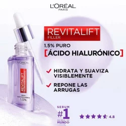 L'Oréal Paris Revitalift Filler Serum es un suero facial antienvejecimiento con una alta concentración de ácido hialurónico que trabaja para rellenar las arrugas y restaurar la textura de la piel desde adentro.