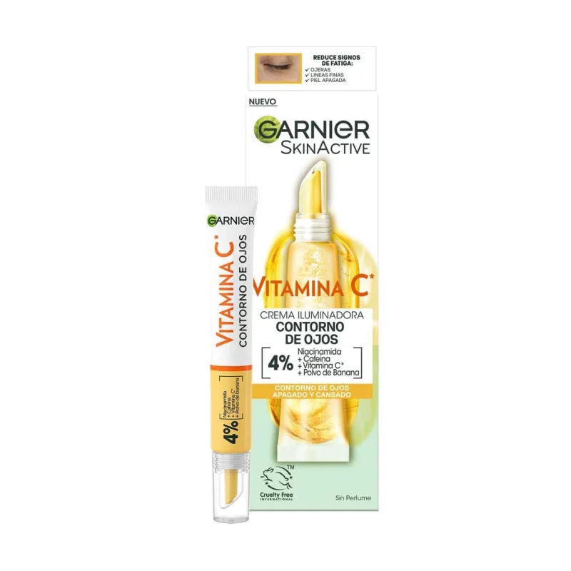 La Crema Iluminadora para el Contorno de Ojos con Niacinamida + Vitamina C* + Cafeína + Polvo de banana reduce visiblemente los signos de fatiga e ilumina la mirada. Resultados clínicamente probados, reduce 6 signos de fatiga: ojeras, líneas finas, tono apagado, falta de firmeza y la falta de suavidad mejorando la apariencia general de la piel. *Derivado de vitamina C.