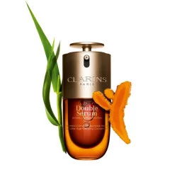El nuevo Double Serum tiene el poder de cambiar el futuro de la piel, gracias a sus dúos reforzados "planta-molécula" que actúan sobre el envejecimiento cronológico de la piel y a su innovadora tecnología de Defensa epi-envejecimiento que ayuda a neutralizar el 100% del envejecimiento causado por el etilo de vida. Su nuevo envase contiene un 94% de materiales reciclables y conserva su [sistema hidrolipídico], que permite preservar las cualidades intrínsecas de las dos fases.Basado en una prueba in vitro en fibroblastos cultivados expuestos a los rayos UV y a la contaminación.