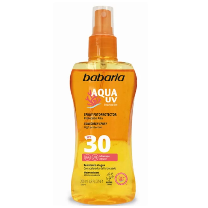 Spray protector solar Aqua UV SPF30 de Babaria, con el que hidratarás tu piel en los momentos que más lo necesita. Cuenta con aceite de zanahoria con el que potenciar la asimilación de los rayos ayudando a la consecución del tono dorado.