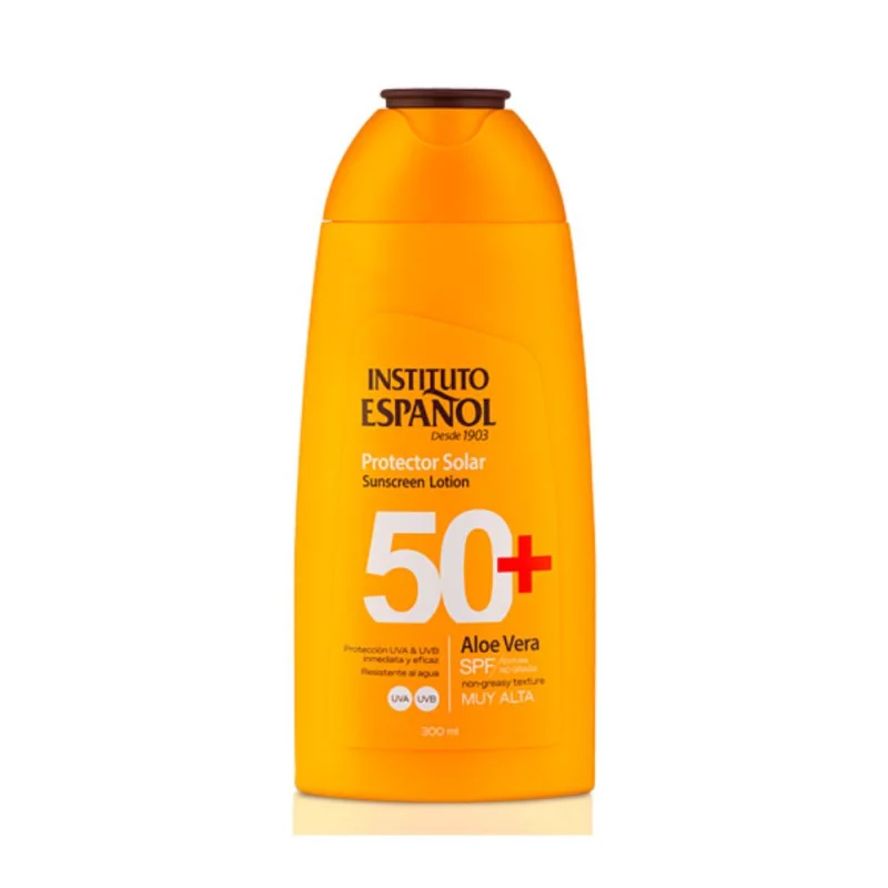 Protector solar muy alta, SPF50+, en formato loción 300 ml. Aporta una protección eficaz e inmediata UVA y UVB e hidratación a la piel. Su fórmula con alta tolerancia a la piel sensible, textura no grasa y resistente al agua. Enriquecida con aloe vera, aporta las propiedades que la piel necesita al exponerse a los rayos solares.