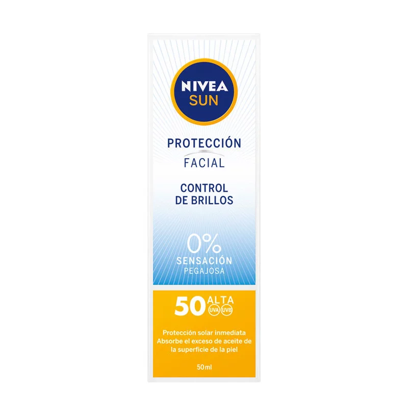NIVEA SUN Protección Facial UV Control de Brillos FP50 está específicamente desarrollada para la delicada piel del rostro. Protege la piel desde el EXTERIOR frente a los rayos UVA/UVB y los efectos de la Luz Visible de Alta Energía, como el envejecimiento prematuro. Además, estimula la protección de la piel desde el INTERIOR gracias a un antioxidante natural que activa el mecanismo de defensa de la propia piel. Su fórmula ligera y no grasa con sensación 0% pegajosa ofrece un efecto matificante instantáneo y duradero. Desarrollada para piel normal/mixta. Ideal para uso diario. Fórmula oftalmológicamente aprobada y compatibilidad con la piel dermatológicamente comprobada.