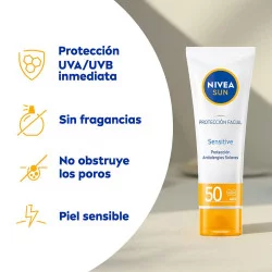 NIVEA SUN Protección Facial UV Sensitive FP50 está específicamente desarrollada para la delicada piel del rostro. Este protector solar protege la piel desde el EXTERIOR frente a los rayos UVA/UVB y los efectos de la Luz Visible de Alta Energía, como el envejecimiento prematuro. Además, estimula la protección de la piel desde el INTERIOR gracias a un antioxidante natural que activa el mecanismo de defensa de la propia piel. Fórmula ligera no perfumada, desarrollada para piel sensible - protege de alergias solares e irritaciones de la piel. Ideal para uso diario. Fórmula oftalmológicamente aprobada y compatibilidad con la piel dermatológicamente comprobada.
