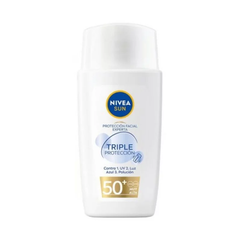 NIVEA SUN UV Face Triple Protección Fluido Ultraligero ofrece protección diaria contra rayos UV , luz azul y contaminación.