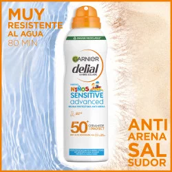 Garnier Delial Niños Sensitive Advanced Bruma Anti-Arena es un spray solar de muy alta Protección Solar SPF50, que protege frente a los rayos UVB y UVA incluso largos, previniendo inmediatamente las quemaduras solares y los daños de la piel a largo plazo. Fórmula de rápida absorción, muy resistente al agua, sin perfume, no pegajoso. Fórmula hipoalergénica. Testado bajo control pediátrico. Fórmula de tacto seco no contiene alcohol y es invisible a la piel. Formulada con tecnología Ceramide Protect que mantiene la piel hidratada y la función barrera de la piel intacta. Garnier apoya la Liga Europea contra el Cáncer en la prevención del cáncer de piel.