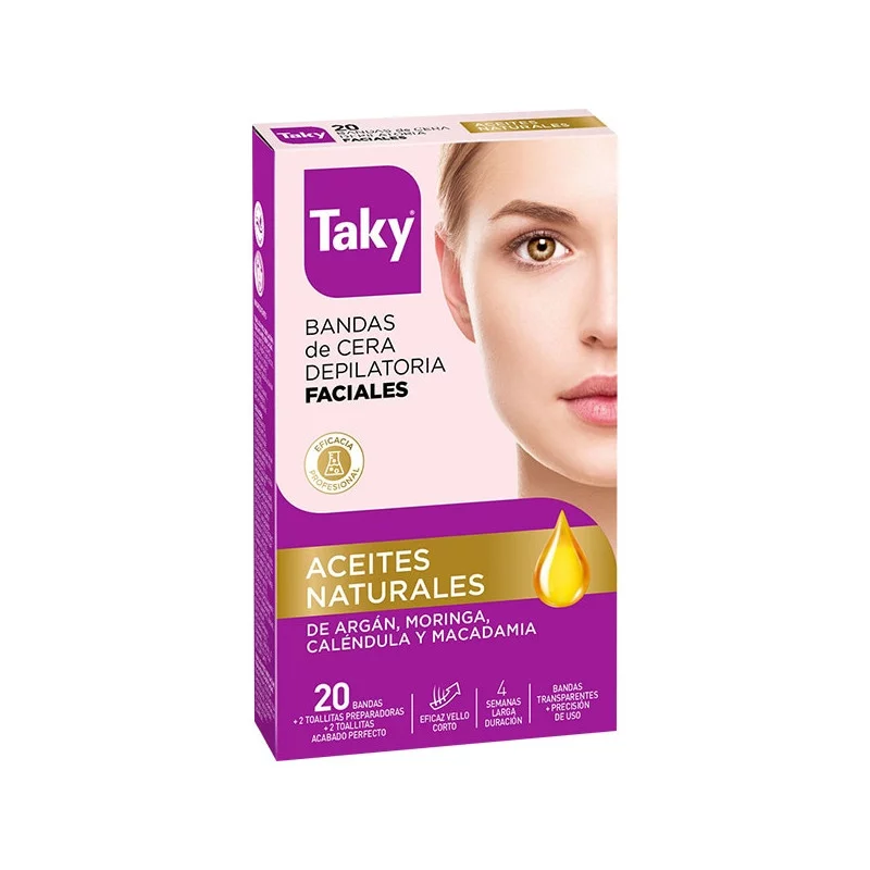 Las tiras de cera facial Taky funcionan de manera efectiva y profesional. Se logra la máxima eficacia y la piel queda radiante con estas bandas doradas que se extiende durante un largo período de hasta 4 semanas. Con un agradable aroma y una textura suave. Su fórmula contiene oro puro, que tiene grandes beneficios antioxidantes y te aporta nutrición y luminosidad.