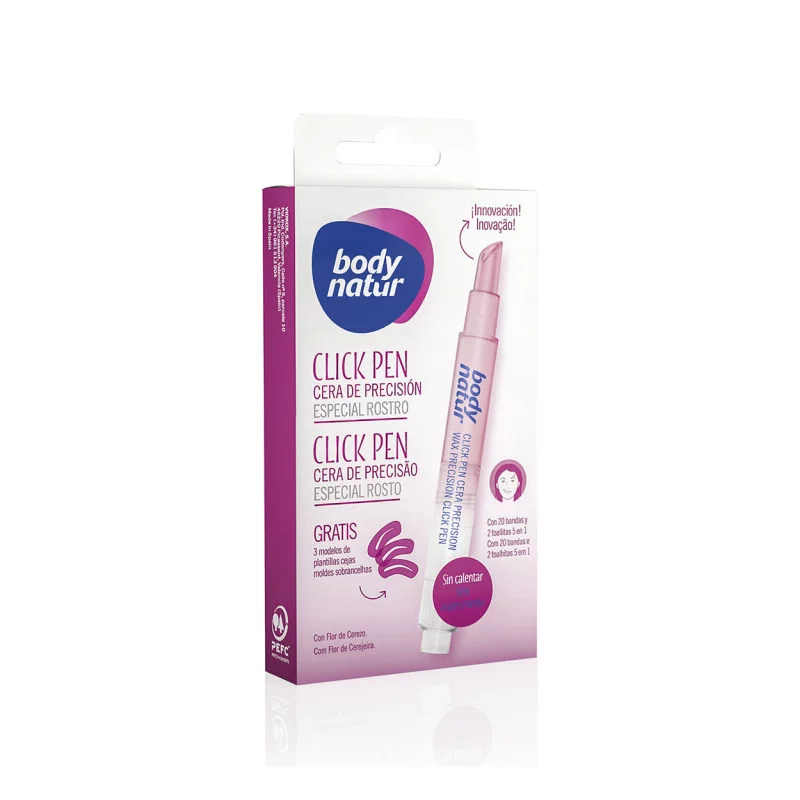Formulada a base de resinas naturales y enriquecida con extracto de Flor de Cerezo, el innovador aplicador Click Pen de Cera Body Natur, resulta idóneo para la depilación del rostro.